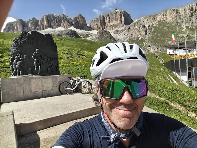 Cesta mi je bila domača, lani sem se tod vozil iz La Ville, ko sem se odpravil na Piz Boe. Takrat sem šel mimo spomenika Faustu Coppiju, legendarnemu italijanskemu kolesarju, petkratnemu zmagovalcu Gira in trikratnemu zmagovalcu v gorski klasifikaciji. In še pomislil ne na to, da bodem skoraj ob letu osorej spet tu s povsem drugačnimi nameni.